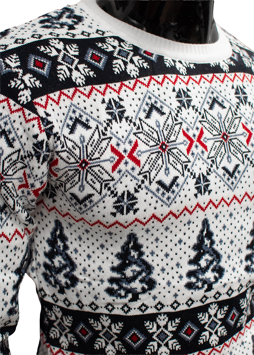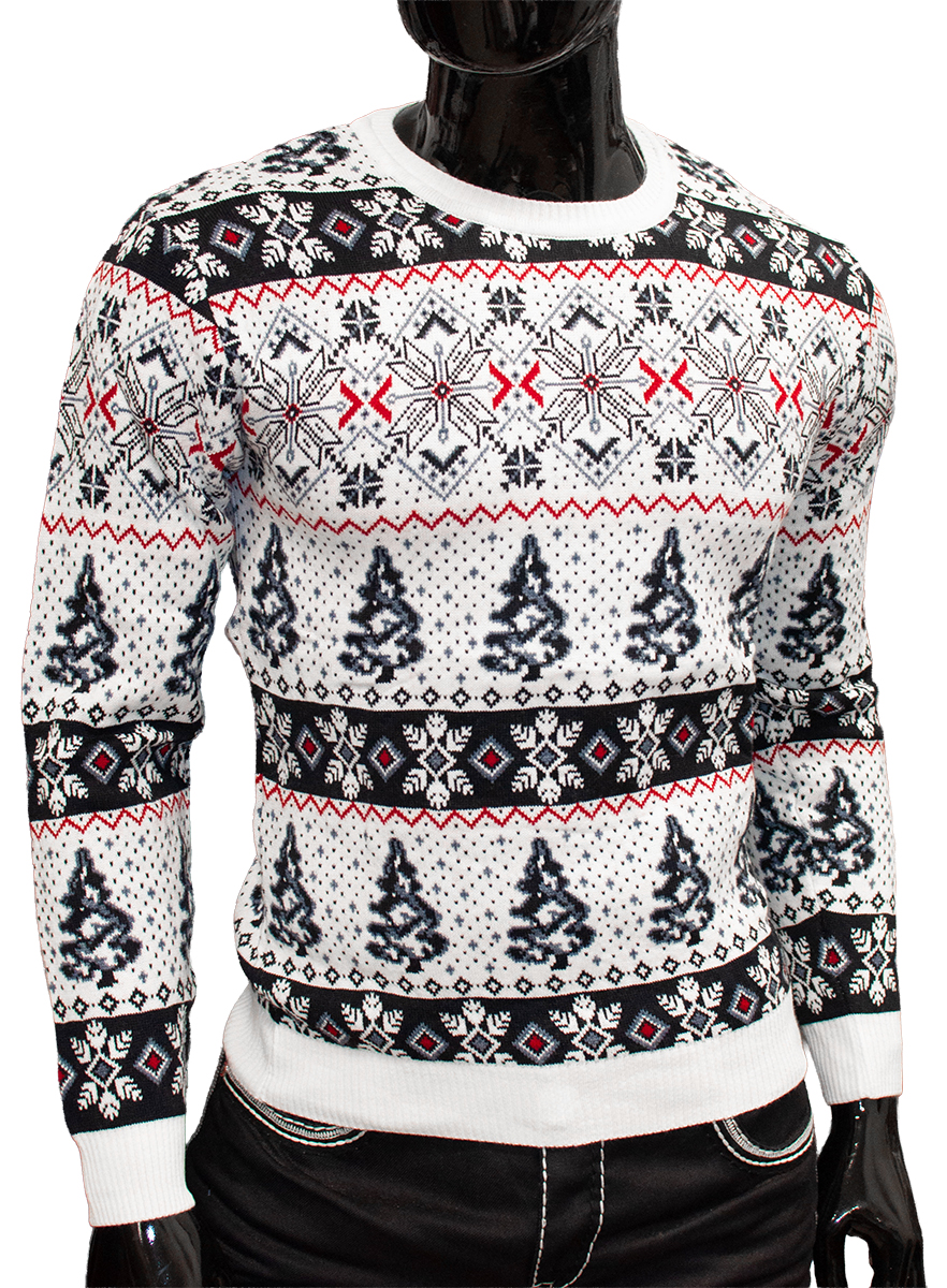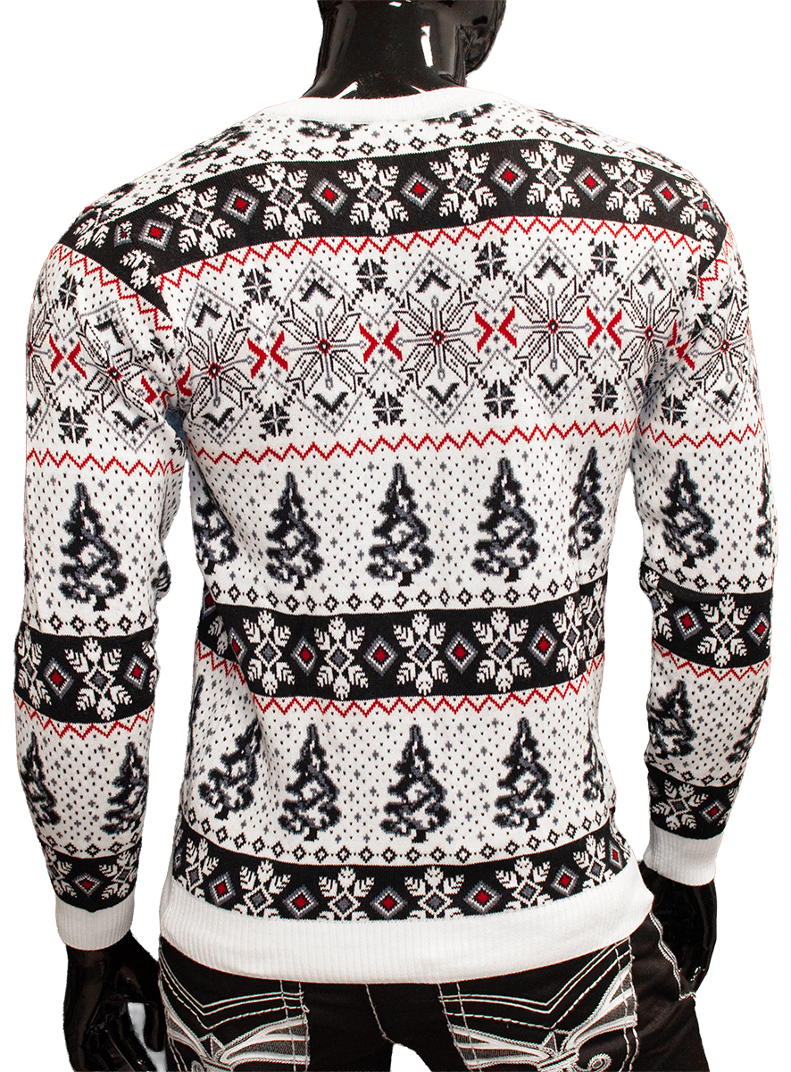 Wprowadź się w świąteczny nastrój dzięki wyjątkowemu białemu swetrowi świątecznemu! Wykonany z miękkiej, przyjemnej w dotyku dzianiny, zapewnia ciepło i komfort nawet w najchłodniejsze zimowe dni. Intensywny biały kolor idealnie wpisuje się w klimat Bożego Narodzenia, a zdobienia w postaci choinek dodają mu uroku i radosnego charakteru.